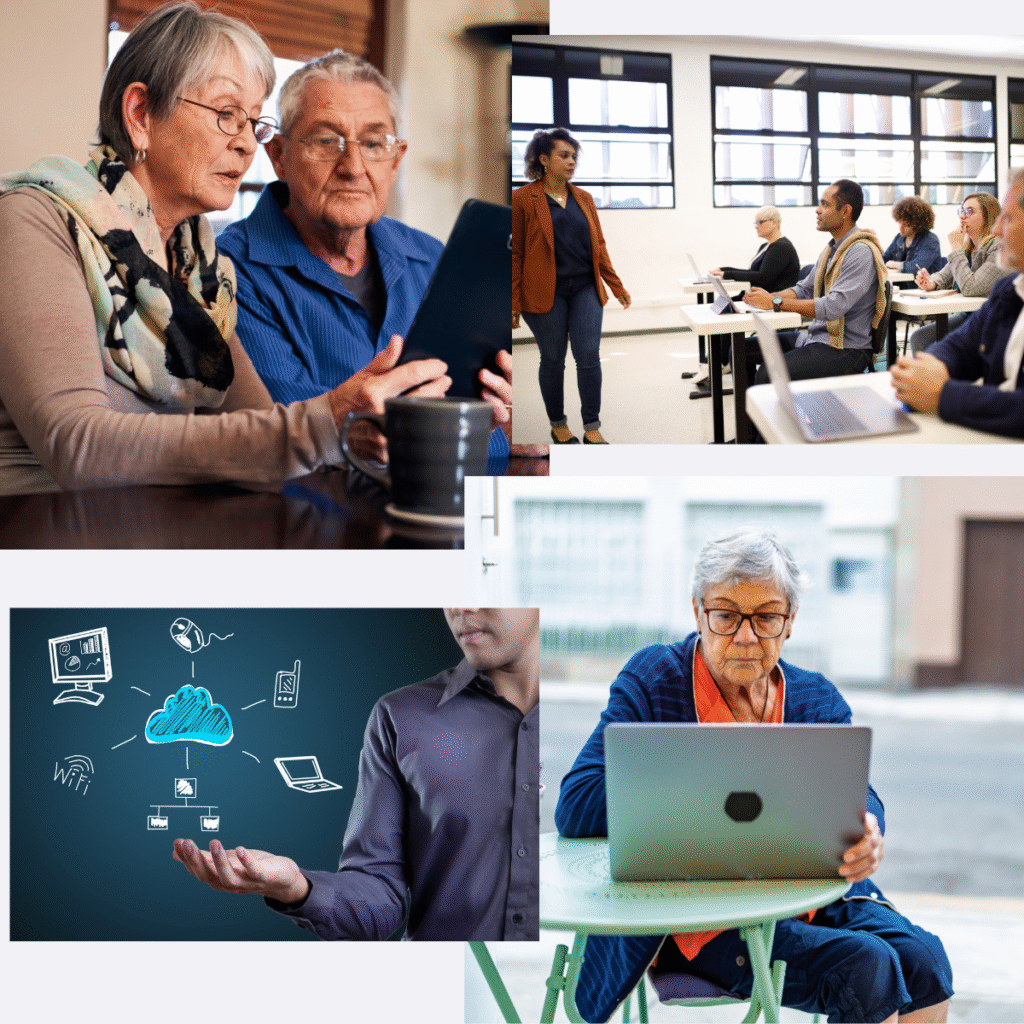 También desarrollo iniciativas de alfabetización digital dirigidas a adultos mayores, enfocadas en facilitar su integración al entorno tecnológico actual y apoyar su participación en la vida laboral, social y comunitaria.
